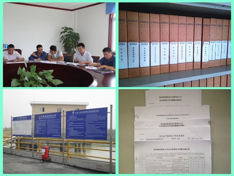 ? ? 為全面提升公司安全生產管理水平,加強內部安全風險管控,建立持續改進的長效機制,揚州海昌于2014年5月份即啟動了普貨碼頭二級安全標準化標創建工作,成立由公司分管領導任組長的創建小組,以《江蘇省港口普通貨物碼頭企業安全生產標準化考評細則》要求,對公司安全目標、管理機構、安全生產責任制、安全投入、設備設施、作業管理等,逐項逐條安排人員進行梳理、修訂、整理相關資料,對現場持續整改、完善和落實,經過自我運行和校驗,于2014年12月中旬完成公司安標自評并上報主管機關。