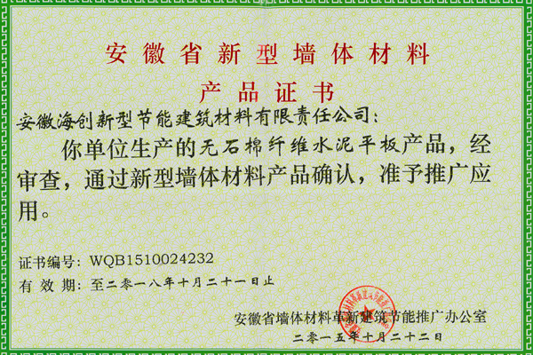 ? ? 為打造海螺板業品牌形象,增強品牌影響力,經過近半年的準備和實施,先后歷經省市兩級專家組現場調研、工藝資料審查、現場實物檢測,以及安徽省革新建筑節能推廣辦公室專家組會議復核評審論證等程序,安徽海創新材料公司所生產的無石棉纖維水泥平板產品終獲省新型墻體材料認證,并取得新型墻體材料產品認證證書。