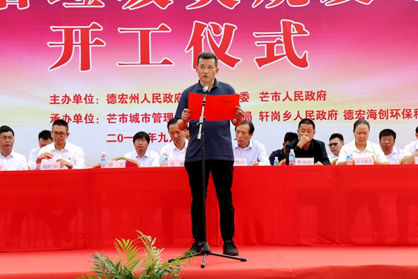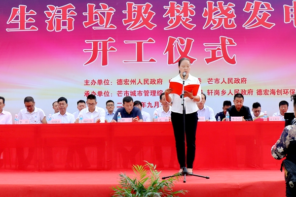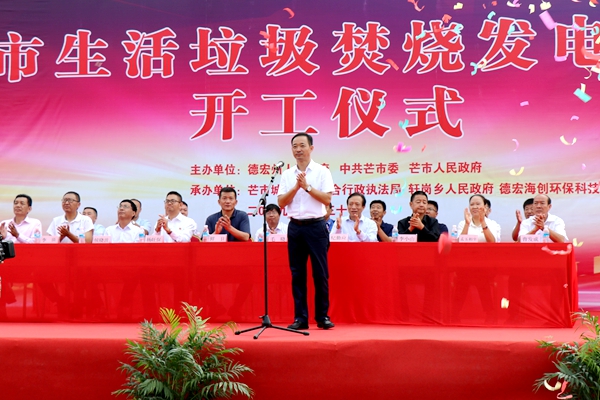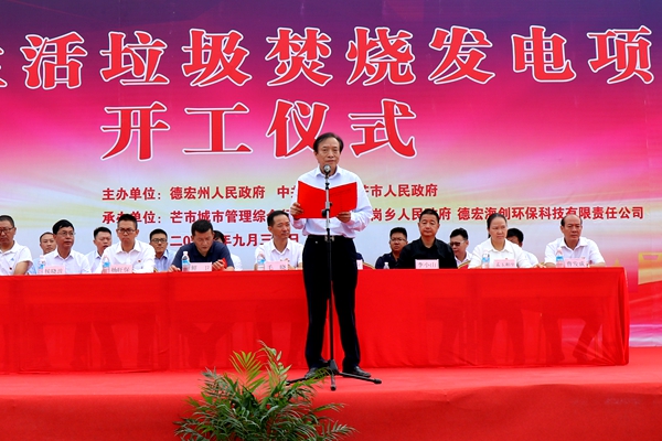 9點(diǎn)30分,儀式正式開始,海螺創(chuàng)業(yè)總經(jīng)理紀(jì)勤應(yīng)代表海螺創(chuàng)業(yè)致辭。他首先向前來(lái)參會(huì)的各級(jí)政府領(lǐng)導(dǎo)、來(lái)賓表示衷心感謝,并向大家介紹了德宏海創(chuàng)的基本情況。他指出,芒市生活垃圾發(fā)電項(xiàng)目是由中國(guó)海螺創(chuàng)業(yè)控股有限公司投資建設(shè),建成投產(chǎn)后能徹底解決芒市生活垃圾圍城的困擾,實(shí)現(xiàn)垃圾的“減量化、無(wú)害化、資源化”。他要求,項(xiàng)目公司要“不忘初心,牢記使命”,按習(xí)總書記“綠水青山就是金山銀山”的綠色發(fā)展觀念,扎實(shí)推進(jìn)項(xiàng)目建設(shè),把項(xiàng)目建設(shè)好、運(yùn)營(yíng)好,打造成德宏州對(duì)外的窗口和名片,成為芒市的工業(yè)旅游點(diǎn)和環(huán)保教育基地,切實(shí)履行好大企業(yè)的社會(huì)責(zé)任,為芒市的生態(tài)文明建設(shè)貢獻(xiàn)力量。