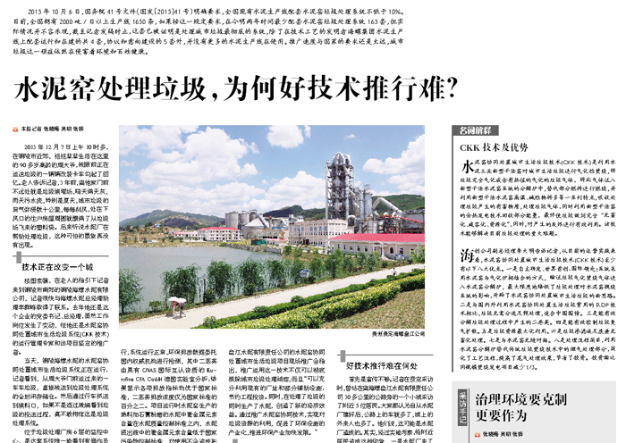????2013年5月,由貴州省環境保護廳和貴州省住房和城鄉建設廳共同起草了《貴州省利用水泥窯協同處置生活垃圾實施方案》,並於當年9月10日,以貴州省政府名義下發了通知,確定將在全省境內建47個水泥窯協同處置生活垃圾設施。《方案》表示,2013至2015年,貴州省住房城鄉建設廳每年安排1.5億元用於對水泥窯協同處置生活垃圾專案建設企業貸款貼息或補助,其中5000萬元用於縣、鎮(鄉)、村垃圾收運系統建設補助;省環境保護廳每年安排1000萬元支持水泥窯協同處置生活垃圾專案建設;貴州省經濟和資訊化委每年安排1000萬元用於水泥窯協同處置生活垃圾專案貸款貼息,鼓勵金融機構加大信貸支持,按照有關政策予以支持。