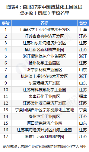 ? ? 2018年11月30日,為落實國家相關產業政策,進一步推動我國化工園區智慧化建設進程,受工業和信息化部原材料工業司委托,中國石油和化學工業聯合公布“中國智慧化工園區試點示范(創建)單位”名單,評選出上海化學工業經濟技術開發區、江蘇省泰興經濟開發區、江蘇如東沿海經濟開發區等17家園區為首批示范單位。