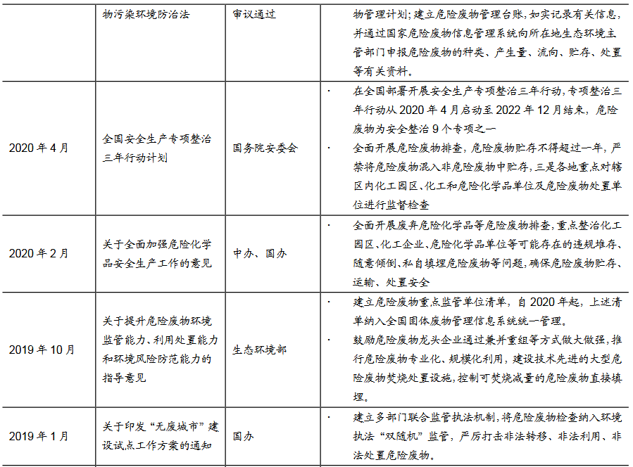 “十三五”以來(lái),從中央到各部委,已出臺(tái)多項(xiàng)關(guān)于危廢排查與清單管理、危廢處理處置設(shè)施管理、問(wèn)責(zé)機(jī)制等體系化政策,此外,環(huán)保督察不斷推進(jìn),逐步由中央下沉至地方,政策層面對(duì)危廢量的提升作用明顯。