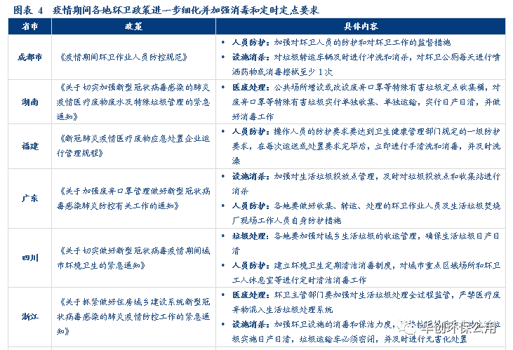 新冠疫情引發公眾對城市管理問題的廣泛關注,環衛服務市場有望實現進一步擴圍。疫情發生后,針對城市環衛管理方面凸顯的臟亂差等問題,全國各省市陸續出臺一系列通知和規范文件,明確了環衛服務領域應對新型冠狀病毒肺炎疫情的工作方案。各項政策文件中分別在醫廢處理、日常垃圾清理、環衛設施消殺、公共環境消毒和環衛人員防護等領域提出了具體的要求,為社會各界應對新冠疫情提供了指導。對于環衛工作的高標準、精細化、專業化的要求,無疑會加大對市政環衛部門工作的挑戰,有利于對專業環衛公司及機構提供環衛服務的需求釋放,環衛服務市場化進程有望進一步加速。