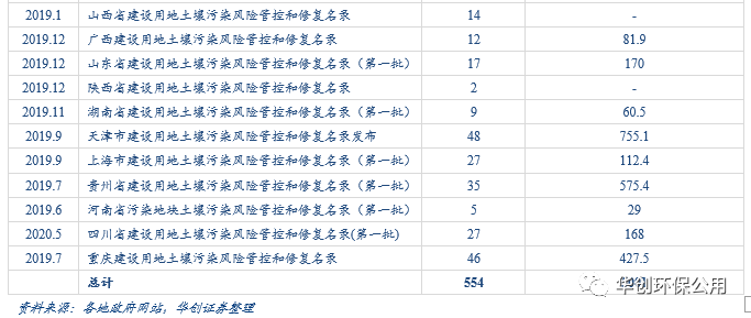 而自2019年年底起,各地方政府的配套政策密集且高效落地,有望成為各地大力啟動修復工程的信號。截止2019年底,華北地區、西北和經濟發達地區均在土壤政策方面大力推進。2020年,山東、廣東、四川等部分省市發布具體土壤防治方案;而在操作層面上云南、上海、廣東等地已經出臺明確的修復流程操作要求。此外,截止2020年5月,全國所有省級行政區已出臺土壤污染風險管控和修復名錄,累計需修復地塊554個,面積約5000萬m2。土壤修復名錄的出臺一方面意味著多省的土壤詳查已經轉移至工業場地領域,另一方面隨著土壤詳查的基本完成,行業進入修復周期,需求有望持續高增。