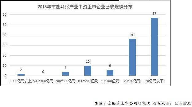 ? ? 在對截至4月30日已披露2018年營收數(shù)據(jù)的節(jié)能環(huán)保產業(yè)中資上市企業(yè)不同營收規(guī)模的企業(yè)數(shù)量情況進行分析的過程中,報告發(fā)現(xiàn),在節(jié)能環(huán)保產業(yè)中資上市企業(yè)中,營收規(guī)模在1000億元以上的有2家,營收規(guī)模在500億元~1000億元之間的企業(yè)數(shù)量為0,多數(shù)企業(yè)營收規(guī)模都在50億元以下。說明我國節(jié)能環(huán)保產業(yè)企業(yè)業(yè)務規(guī)模普遍較小,行業(yè)集中度不高。