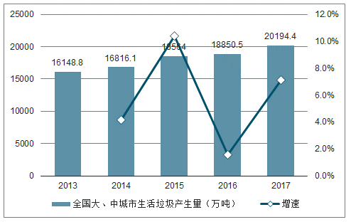 2013-2017年全國大、中城市生活垃圾產生量統(tǒng)計及增速