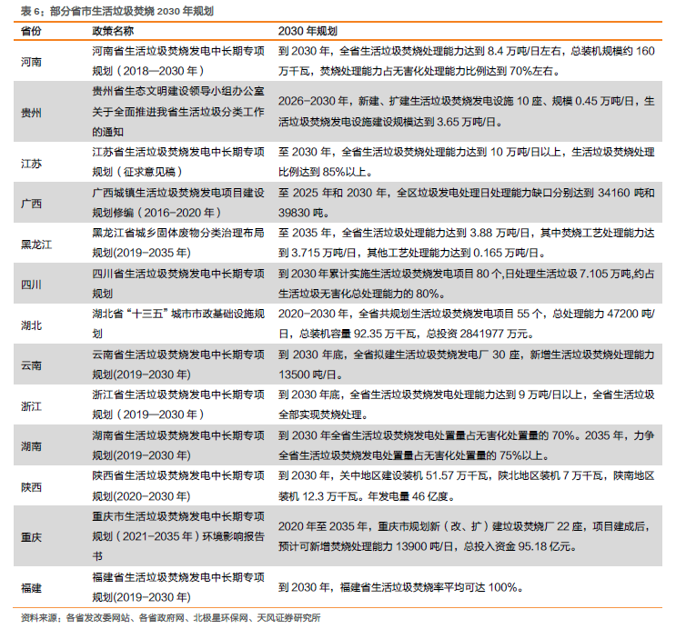我國焚燒占比相較國外仍有較大提升空間,從各省份產能規劃來看,未來5-10年垃圾焚燒產能建設需求較旺盛。近兩年各省市生活垃圾焚燒中長期規劃紛紛出臺,多地明確指出要新增垃圾焚燒廠以提高焚燒處理能力,并設置了較高的焚燒占比規劃目標。例如江蘇省提出在2022年-2030年新(改,擴)建垃圾焚燒廠39座,預計新增垃圾焚燒處置能力4.5萬噸/日;福建省提出到2030年生活垃圾焚燒率平均可達100%。對比部分地區2020年存量產能與2030年規劃產能,仍有接近兩倍的提升空間,預示未來5-10年垃圾焚燒產能建設需求較旺盛。