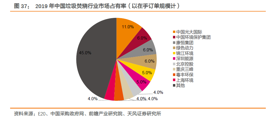 垃圾焚燒企業加速“跑馬圈地”,在手訂單規模不斷擴大。前些年在一系列政策大力支持下,各城市競相建立垃圾焚燒發電廠,并在國內掀起投資并購浪潮。行業外企業通過并購快速切入垃圾焚燒領域,行業內企業借助并購迅速擴大自身規模。例如,2011年,水務領域龍頭首創股份通過收購新環保能源,將業務拓展至固廢處理領域;2013年,瀚藍環境收購創冠環保(中國)有限公司100%股權,垃圾規劃處理能力一年內提升四倍。并購趨勢下,龍頭企業在手規模不斷擴大,截至2019年,在手訂單規模前十企業市占率達55%,前三占有率分別為11/6/6%。