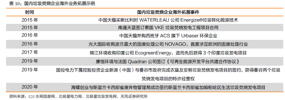 海外拓展穩步推進,龍頭企業擁有多個海外運營項目。隨著國內焚燒設備及技術的日漸成熟,國內垃圾焚燒發電企業已由早期的技術引進者轉向設備、技術輸出者,并通過海外并購等方式迅速開拓海外市場。目前已有多家企業擁有數個海外投資運營的垃圾焚燒發電項目,涵蓋東南亞、歐洲乃至美洲等多個區域。