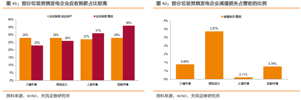 初始投資較大疊加存量項目補貼拖欠,垃圾發電企業普遍呈現高負債、高財務費用率的特征。垃圾焚燒項目前期投資較高,企業投產高峰階段資本支出較大,導致現金流承壓;同時為了滿足融資需求,企業財務杠桿也較高,導致財務費用率較高。此外,在存量項目補貼拖欠的影響下,一方面,企業賬面存在較多應收賬款,資金回籠受限;另一方面,計提的大額減值損失對企業利潤也有一定侵蝕。以幾家垃圾焚燒龍頭企業2019年財務數據為例,應收賬款占流動資產及營收的比例較高,減值損失占營收的平均比例也達到1.2%。