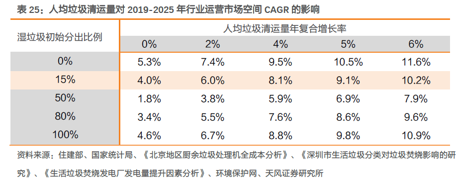 從靜態時點看,相較垃圾分類前,分類后焚燒處置量會出現一定下滑。但從長期動態視角看,目前我國經濟仍處于穩步發展過程中,城鎮化率仍在持續提升,人均垃圾產量仍處于緩慢上升通道,且焚燒占比仍有提升空間,焚燒處置量有望逐年增加,疊加垃圾分類及技術進步驅動下的噸上網電量提升,垃圾焚燒發電行業運營市場空間有望保持正增長。綜合各類影響因素,我們預計2019-2025年,垃圾焚燒發電行業運營收入CAGR約7%。