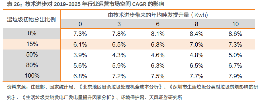 ⑥由技術工藝優化導致的噸發提升量:據《生活垃圾焚燒發電廠發電量提升因素分析》介紹,李坑一廠借助中溫超高壓技術,噸垃圾發電量達350~360kWh,以及在垃圾熱值相近的情況下,中溫次高壓余熱鍋爐發電量增加17%。我們假定技術優化帶來噸發電量提升50Kwh,由2019年300Kwh線性提升至2025年350Kwh。