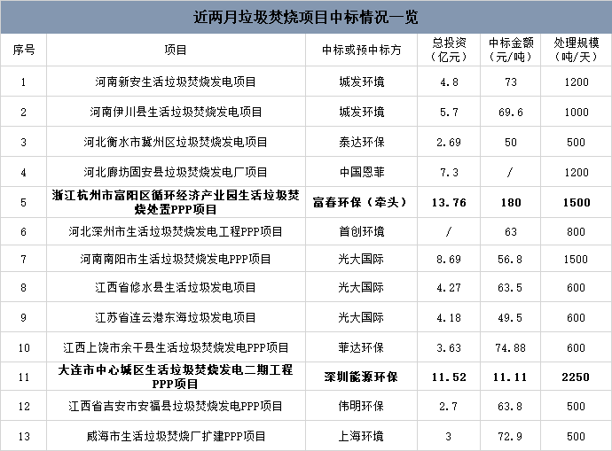 ? ? 環境商會對6月以來的垃圾焚燒項目的中標情況進行了簡單盤點,不完全統計顯示,這兩個月來,有13個垃圾焚燒項目發布中標公告,具體如下: