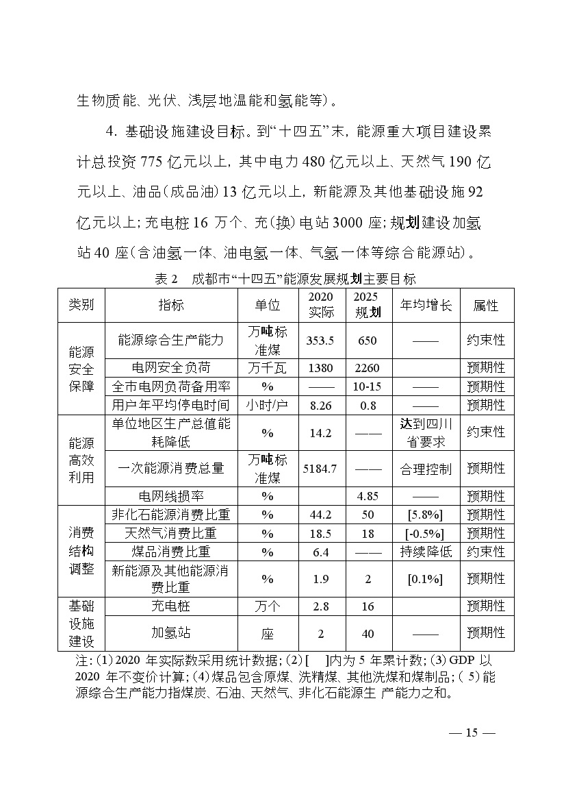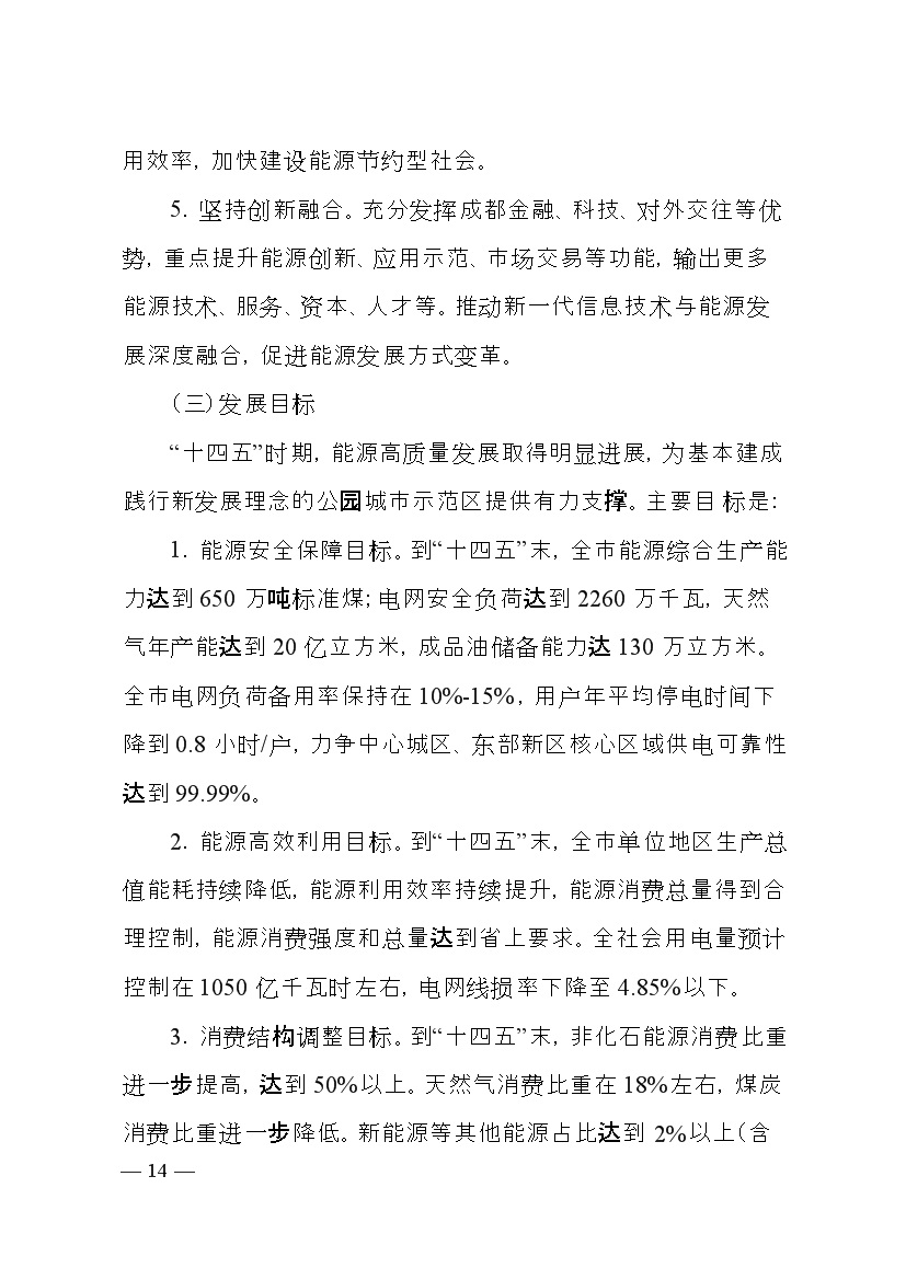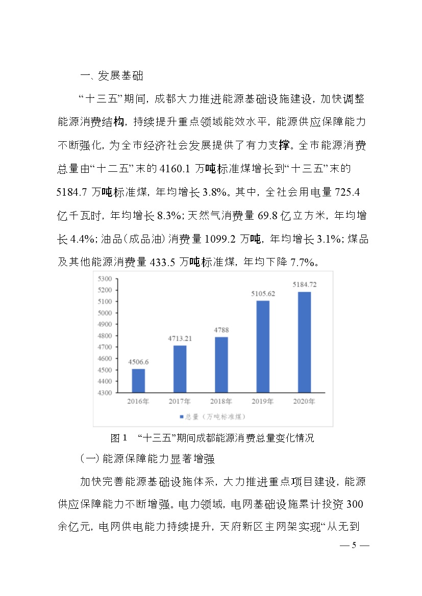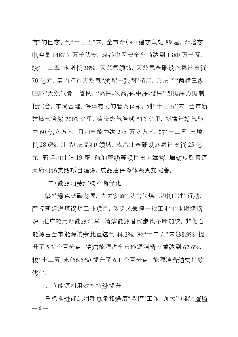 成都市人民政府印發《成都市“十四五”能源發展規劃》,明確了以創新發展為動力,以強化保障能力為抓手,加快構建新型電力系統,持續推進清潔能源替代,優化能源消費結構,全力提升能源利用效率發展思路。并提出總量控制目標、消費結構目標、能源安全保障、等能源節約目標、基礎設施建設等發展目標。