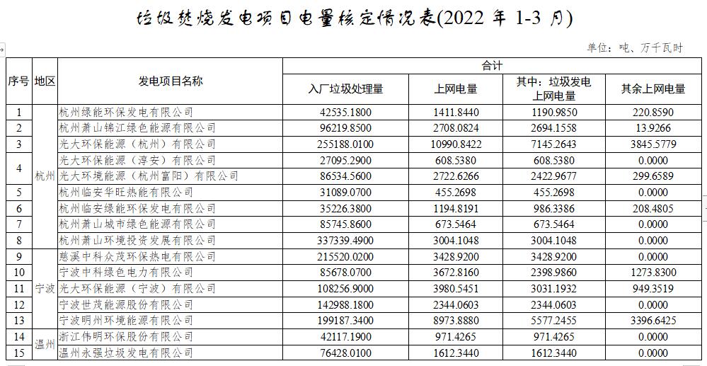 日前,浙江發布關于核定垃圾焚燒發電項目2022年1-3月垃圾發電上網電量等事項的通知。詳情如下: