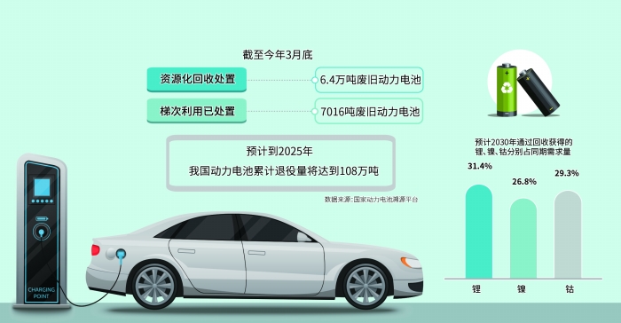 據國家動力電池溯源平臺數據分析,截至今年3月底,我國再生利用企業已資源化回收處置6.4萬噸廢舊動力電池,梯次利用已處置7016噸廢舊動力電池,并以此生產了780MWh的梯次產品。與此同時,基于動力電池產銷量和生命周期,預計到2025年我國動力電池累計退役量將達到108萬噸。