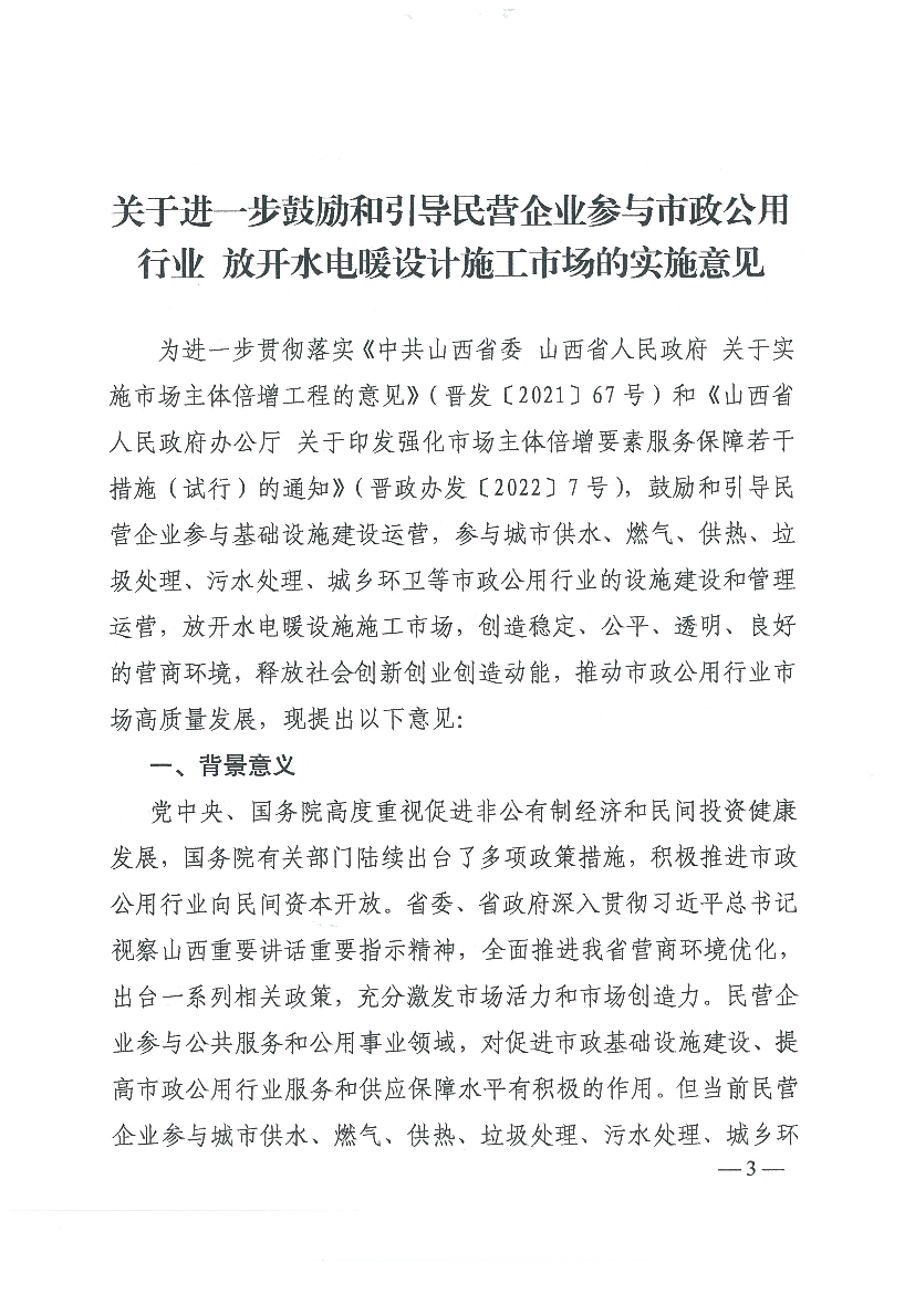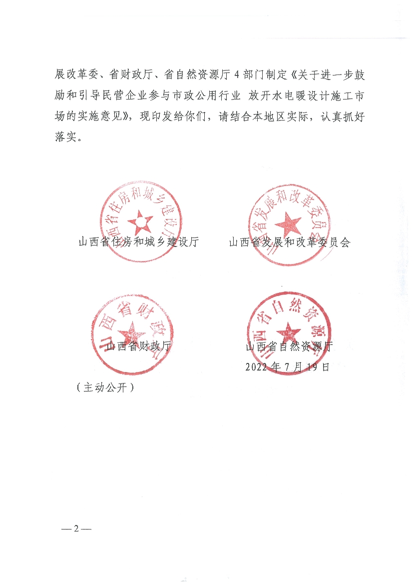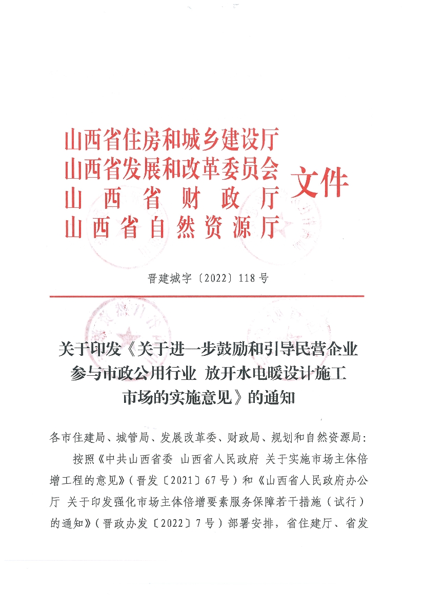 山西省住房和城鄉建設廳等四部門關于印發《關于進一步鼓勵和引導民營企業參與市政公用行業 放開水電暖設計施工市場的實施意見》的通知