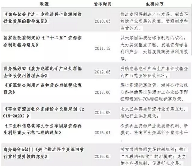 ? ? 2015年7月,國務院發布《國務院關于積極推進“互聯網 ”行動的指導意見》,引導再生資源回收行業向信息化、自動化、智能化方向發展,促進再生資源交易透明化、便利化。2016年5月,商務部等國家六部委印發了《關于推進再生資源回收行業轉型升級的意見》。強調推廣“互聯網 回收”的新模式;建立完善各項機制,促進行業發展。