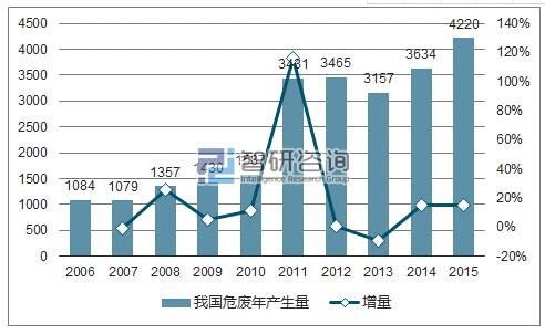 ? ? 我國危險(xiǎn)廢物的調(diào)查統(tǒng)計(jì)在2011年之前,工業(yè)企業(yè)危險(xiǎn)廢物申報(bào)下限是10kg,而2011年之后環(huán)保部門將危廢申報(bào)下限調(diào)整為1kg,所以2011年之后的危險(xiǎn)廢物全年統(tǒng)計(jì)量較往年有很大的躍升。根據(jù)統(tǒng)計(jì)數(shù)據(jù),2015年全國危險(xiǎn)廢物產(chǎn)生量達(dá)4220萬噸,較2014年增長16%。從趨勢上看,危險(xiǎn)廢物的產(chǎn)生量仍呈現(xiàn)不斷上升趨勢。根據(jù)資料,2009-2013年美國工業(yè)固體廢物年產(chǎn)生量約在7.5億噸左右,而危廢產(chǎn)量則穩(wěn)定在3500萬噸左右,危廢產(chǎn)量占比4.6%,而其他國家的情況是:挪威、瑞士、韓國占比分別為8%、7%、4.5%。從發(fā)達(dá)國家的經(jīng)驗(yàn)來看,危險(xiǎn)廢物產(chǎn)生量為固體廢物的3%左右。我國近幾年工業(yè)固廢產(chǎn)量在30億噸左右,估算當(dāng)前危險(xiǎn)廢物的實(shí)際產(chǎn)量達(dá)6000-10000萬噸。