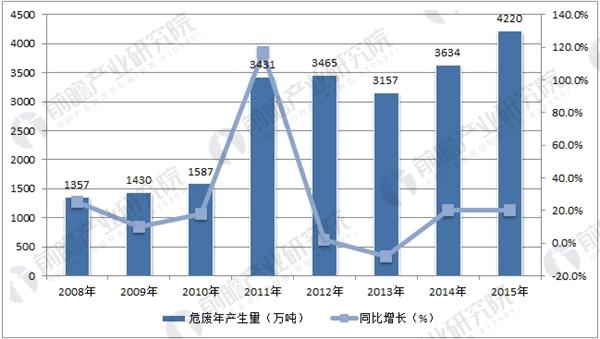 ? ? 根據(jù)前瞻產(chǎn)業(yè)研究院發(fā)布的《危廢處理行業(yè)市場前瞻與投資分析報告》統(tǒng)計數(shù)據(jù),2015年全國危險廢物產(chǎn)生量達(dá)4220萬噸,較2014年增長16%。危廢產(chǎn)生量仍呈現(xiàn)不斷上升趨勢。從發(fā)達(dá)國家的經(jīng)驗來看,危險廢物產(chǎn)生量為固體廢物的3%左右。我國近幾年工業(yè)固廢產(chǎn)量在30億噸左右,估算當(dāng)前危險廢物的實際產(chǎn)量達(dá)6000-10000萬噸。