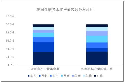 ? ? 區域分布與危廢產區高度匹配:水泥在是傳統意義上的“短腿”產品,業內普遍認為其經濟銷售半徑為公路<300公里、鐵路<500公里。因此水泥產能的密度與當地經濟發展水平和基建需求直接相關。同時,危廢來自工業生產過程,同樣與經濟發展水平相關。如下圖所示,水泥產能分布與危廢產量分布情況區域匹配度整體較高。因此,水泥窯協同處置工藝的區域適用性較強,適于在全國范圍內推廣,作為普適的協同處置技術,填補全國各地傳統危廢產能供需缺口。