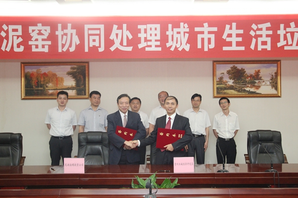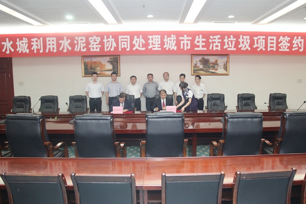 Lu Xiuyun, the representive of Shuicheng economic development zone and Ji Qinying, the general manager of Conch Venture, signed on the cooperation agreement. The two sides agreed that Conch Venture will invest to construct a set of system about municipal waste disposal via cement kiln with the daily capacity of 200 tons in Shuicheng Conch plant, and the government of Shuicheng economic development zone will be responsible for the collection, transfer, transportation and subsidising waste disposal.