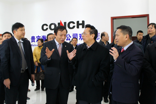 He was pointing that one important task of his research works on energy conservation in Guizhou is to research on ecology and environmental protection projects, and enlarges the environmental protection industry. The innovative development of new environmental protection technology depends on not only the market mechanism which has to be introduced but also the promotion from government. It has to comply with the market criterion and is in need of policies support. The party’s third plenary session of 18th pointed out the direction for the use of resources and the compensation for the ecological environment. There is huge space for the marketization of environmental protection which needs a strengthened development. Guiding Conch’s project is a good environmental protection project. He hoped that some departments by which he was accompanied such as NPC, NDRC to do serious research on environmental protection project, especially the research on industry supporting policies to help promoting this project. He also hoped that Conch Venture could further enhance the techology research and update, reduce the investment cost and enrich the corporation mode between government and between peer.