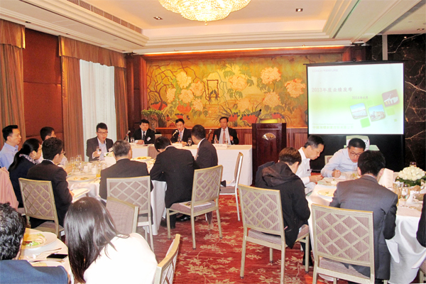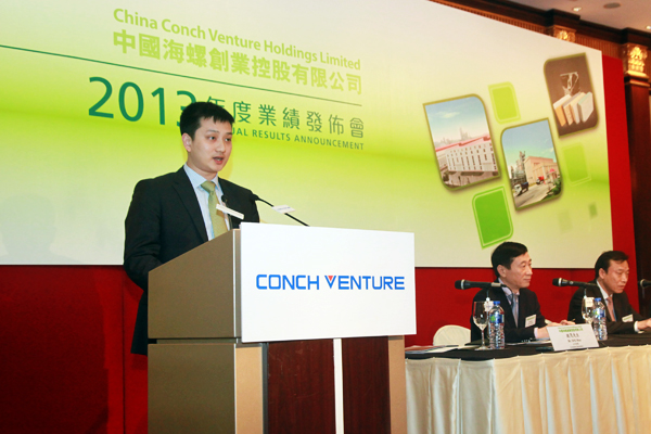 On 1 April 2014, Conch Venture presented its 2013 annual results in Hong Kong island Shangri-La hotel, chairman Mr Guo Jingbin, execuitve director and general manager Mr Ji Qinying, company secretary Mr Shu Mao and deputy director of financial department Mr Chen Xingqiang attended the meeting. This is the first roadshow since company got listed on 19 December last year, which attacted much attention. Almost 138 investors and analysists attended the meeting where no one empty seat was left.
